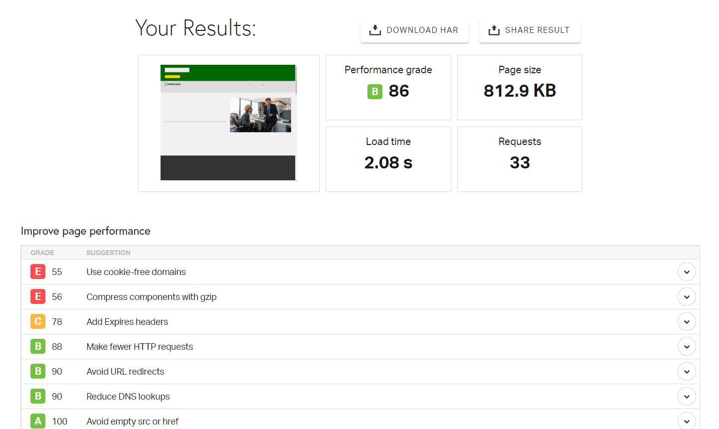 Pingdom’s load speed improved from C (80) to A (96) using these methods on a simple test site, which resulted in a load time of under two seconds.